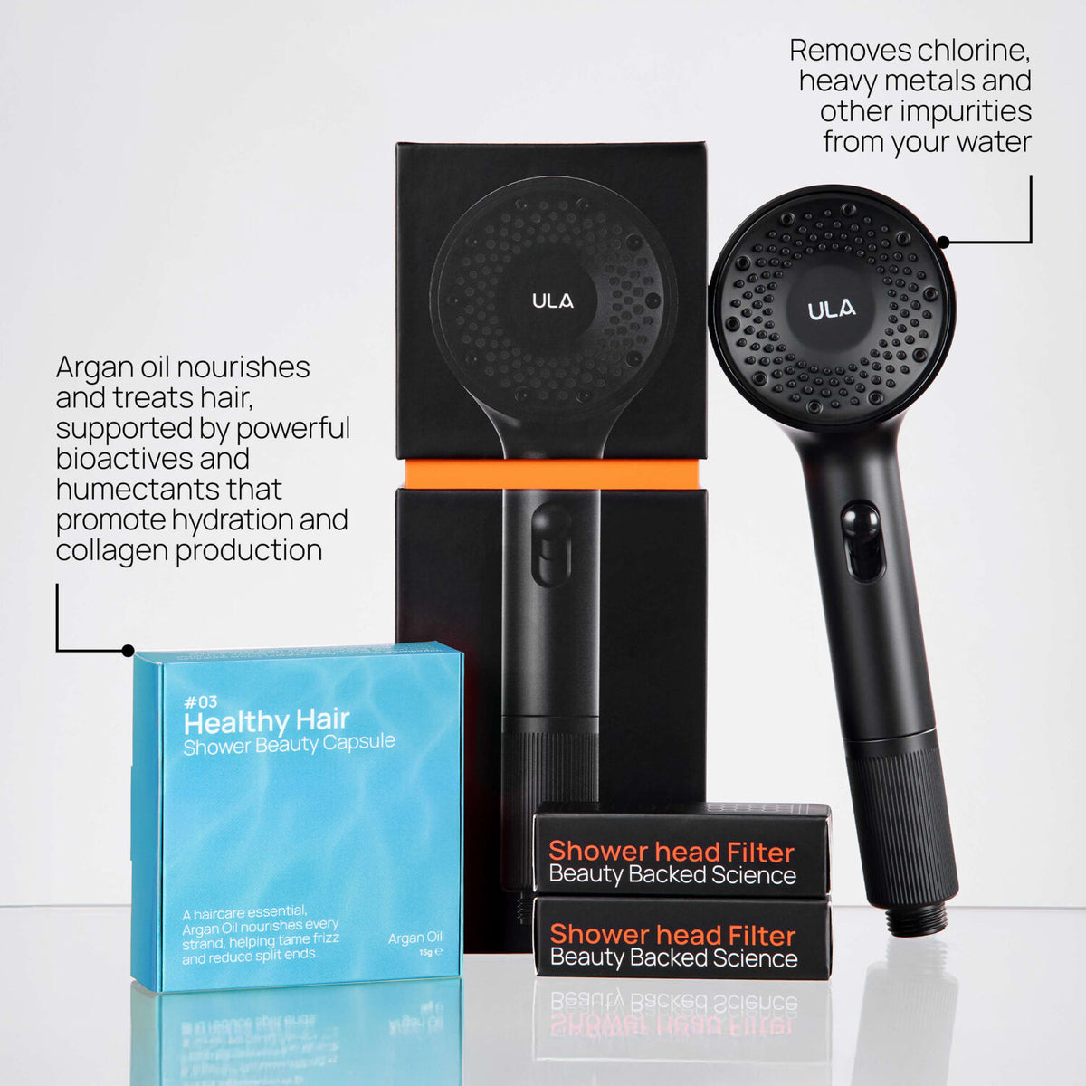 ULA removes the majority of harmful minerals in your water – which works better with the PH levels of your skin, hair, and product, leaving you feeling softer, cleaner, and clearer than ever before.